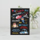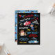 Super cute Cops and Robbers birthday party invitation with fun funky fonts. Features a police man hanging like a superhero from a helicopter, holding a donut, a robber or escaped inmate with a bag of cash, handcuffs, megaphone and police car.