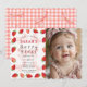 The entire design is set against a soft, light red gingham background that gives it a sweet, airy, and "Cottage core" feel. Charming watercolor strawberries and dainty red bows accent the corners, making it the perfect choice for a summer picnic, a garden party, or a "Sweet One" celebration.
