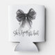 Simple minimalist black and white 'She's tying the knot' themed bridal shower can cooler showcasing an elegant coquette style black bow and modern calligraphy script.