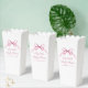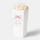Cute party favor popcorn boxes for your baby girl shower featuring soft pink coquette bow watercolors. The words "Baby Shower" and the name of the mother-to-be are showcased in an elegant pink script.