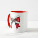 This festive ceramic mug features a bright red interior and handle, complemented by a large red bow design on the front. The bow has soft, white fur-trimmed edges and a gold buckle detail, giving it a cheerful holiday look that’s perfect for seasonal sipping.