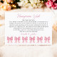 Share your honeymoon wishes with this charming Coquette Pink Bow Honeymoon Wish Bridal Shower Card. Featuring a row of delicate hand-drawn pink bows along the bottom, this card offers guests the opportunity to contribute to the couple’s honeymoon fund in lieu of traditional gifts. The soft blush tones and elegant script make it a perfect addition to any bridal shower with a chic or holiday-themed vibe. Personalize with your details to create a thoughtful and stylish request.
