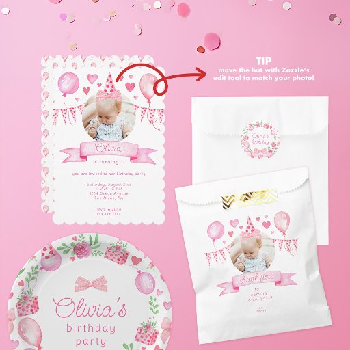 Pink coquette illustrations featuring preppy bows, gifts, balloons, flowers and hearts to celebrate a feminine cute baby girl birthday party. The date of the birthday is featured over a vintage ribbon banner at the bottom of this beaufitul watercolor design.