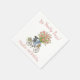 These napkins feature a watercolor portrait of a cute little puppy sitting on a bike with a large bouquet of pink flowers and blue and white bows.