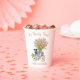 These paper cups feature a watercolor portrait of a cute little puppy sitting on a bike with a large bouquet of pink flowers and blue and white bows.