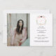 This graduation party announceent design style could be described as grandmillennial or coquette. It features a watercolor crest with a light pink ribbon with a graduation cap on top. You can personalize with an initial and a photo.