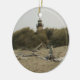 View of Coquille River Lighthouse from the beach. The top is peering above the grassy ridge with old driftwood in the sand. Located at Bullards Beach State Park, in Bandon, Oregon.