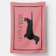Family name outdoor house flag, done in coral with a black outline border and black silhouette of a dachshund. Personalize the custom text with your family name.