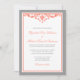 Plain white envelopes are included with paper invitations and will come to fit the invitation size you select. If you don’t need the envelopes, you may choose to not receive them by selecting the dropdown below "Envelopes" and choosing "None." If you’d like to have a design on your envelopes, you can browse all of these available envelopes to find the design that complements your Coral And Gray Flourish Wedding Invitations.