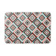Bath mat with a bold modern pattern made up of many sizes of diamond shapes in coral orange, mint green, black, and white.