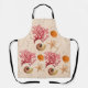 Sand and seashells apron. Decorated with red fan coral, nautilus, starfish, and orange scallop seashell. Matching oven mitt, pot holder, paper plates, napkins, and coasters are available.
