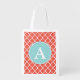 A bright coral pattern with an aqua accent decorates this reusable shopping tote. Personalize this tote bag by changing the monogram letter. Use this stylish tote bag for shopping, school, groceries, travel, crafts, etc....The design is from original art.