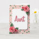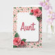 Designed with a soft-edged white panel at the center, this card keeps the focus calm and affectionate. The word “Aunt” sits prominently on the panel in a flowing coral-pink letter style, with a gentle shadow that makes it look slightly raised. Clustered flowers frame the panel in a balanced, off-center way, like a thoughtful hug around the message ❤️. Larger layered coral blooms appear at the top right and bottom left, paired with olive-green leaves that show faint vein details. The overall look suggests closeness and gratitude through the careful spacing and the tender, welcoming color palette. Outside the white panel, the background is filled with a repeating pattern of flat peach flowers with orange centers, mixed with dark green leafy shapes and tiny dash marks 🌼. The pattern sits on a light, fabric-like texture with soft lighting across the full scene.