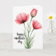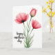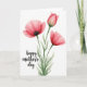This design shows a soft watercolor bouquet on a bright white background, with three flowers rising upward like they’re leaning in close to one another ❤️. Two blossoms are fully open and one is still a bud, all in a coral‑pink tone that suggests a gentle, affectionate mood. The petals fade from deeper color at the edges into a lighter blush toward the center, giving them a tender, airy look. Slim green stems lift the blooms from a small cluster of curved leaves, arranged neatly near the lower middle of the card. In the main open flower, dark, detailed stamens add contrast and draw your eye inward, like a quiet moment of attention. Below the bouquet, a short message sits centered in a flowing dark gray line of text, with a smaller line beneath it in a lighter shade 🌼. The flower edges are slightly ruffled, and the paint washes leave soft, translucent layers against the white space.