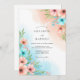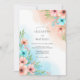 Delicate watercolor washes in soft coral and sky blue create a dreamy backdrop for vibrant blossoms. Lush green foliage intertwines with charming floral elements, evoking a romantic and whimsical mood for your special day. This artistic arrangement lends a touch of nature's beauty.