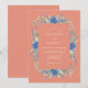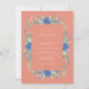 This design features a warm coral backdrop that beautifully contrasts with vivid blue roses and delicate lavender sprigs. Lush eucalyptus leaves and greenery add a refreshing botanical touch to the artistic arrangement. The palette combines earthy peach tones with cool blues and soft purples for a romantic spring atmosphere.