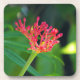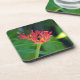 The coral bush is in the jatropha family. It's a very pretty tropical plant. The original photograph by MaeFlowers on this Coaster is a closeup of a coral bush, sometimes called a coral palm. We see a beautiful deep pink bloom up close, with tiny yellow flowers starting to emerge. We see the bush's long, thin green leaves behind, and more natural greens in soft focus in the background of the photo.