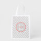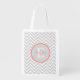 Tote your groceries home with a Coral Chevron Monogram Reusable Grocery Bag. Bag design features a light gray chevron pattern with a circle emblem outlined in coral. Additional items available with this design as well. Please contact me directly for assistance with personalization.