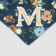 Coral and blue floral dog bandana monogrammed with your dog's initial in pale yellow and white against a dark blue background. The floral pattern features blue, coral, and pale yellow flowers, and green leaves and pale berries, against a dark blue background.