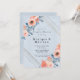 Design features a printed colored floral element in shades of coral and dusty blue with peony rose floral blooms with calligraphy script or type writing. Gold geometric frame on some, mix and match collection piece. Great for your wedding celebrations!