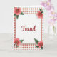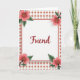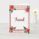 This greeting card features a white rectangular panel centered on the front, outlined by a thin coral border that feels soft and welcoming. In the middle of that panel, the word “Friend” appears in flowing cursive-style lettering, colored deep crimson like a small declaration of closeness ❤️. Surrounding the panel is an all-over pattern of tiny coral flowers with small green touches, arranged neatly across a creamy background. The repeating blossoms create a cozy, slightly retro look, like something saved from a favorite letter. In each corner of the central panel, a larger salmon-pink flower opens outward, as if leaning in toward the word in the center. Dark, slender stems and rich green leaves frame these blooms, and the golden stamens add a gentle glint that suggests care and attention 🌼. The creamy backdrop is filled with evenly spaced coral blossoms, each with subtle green accents.