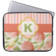 This floral and striped patterned laptop sleeve is ready for your personal monogram. Created in a pretty palette of coral pink hues and soft greens Choose your size in the drop down menu.