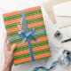 This wrapping paper design features a pattern of stripes having colors like coral and green. Wrapping paper like this might be used when wrapping gifts or presents being given to celebrate a birthday, a wedding, an anniversary, or some other event.