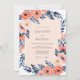 This design features a lush arrangement of coral and peach peonies paired with deep indigo blue foliage. The watercolor style creates a romantic atmosphere, perfect for a spring event. Soft cream highlights and delicate leafy branches surround the artwork. The warm and cool tones provide a sophisticated contrast.