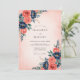 This romantic design features lush watercolor clusters of coral roses and navy blue anemones paired with delicate sage green foliage. A soft peach watercolor wash serves as a warm, artistic backdrop for the floral arrangements. The aesthetic combines deep indigo tones with vibrant salmon hues for a sophisticated and modern seasonal look.