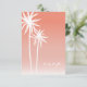 A unique beach wedding rsvp featuring an illustration of two white palm trees at left over a coral ombre background.