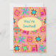 Invite a quilter or quilt lover with this colorful fully customizable quilt invitation. Fully customize on the front and back to add your own words, names and other information. This original quilt art makes a vibrant invitation. Quilt art based on original art features favorite patchwork quilt blocks plus unique blocks in vibrant and dynamic colors of orange, yellow, pink, turquoise, and lime green on a coral orange background for a beautiful color palette. A sunny yellow oval is on the front of the card to say "You're Invited" or other words of your choice. Show your love of quilting with these quilt art designs with other quilt art products. Quilt art is original art from fabric and quilt designer Phyllis Dobbs and is in a fabric collection from Quilting Treasures. This art is available on other products and in several color backgrounds. More products are available in Phyllis' BusinesswithFlair store. Match with coordinating stamps, envelopes, stickers and return address labels.