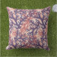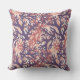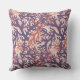 Throw pillow with a pattern of overlapping corals in dark purple, red, and peach.