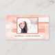 A modern business card template featuring your own photo framed by a wood design with painted stripes in warm coral and white colors.