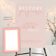 The Welcome sign reverses to a complimentary coral pink background with a matching hand-lettered script xoxo pattern with a white inset for signatures or messages to display at your next event. A cute and fun choice for a Galentine event, Valentine’s party, Anniversary celebration, Birthday gathering, Baby Shower, Bridal, or Bachelorette party with the girls.