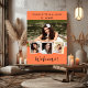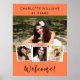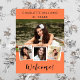 Create your own unique photo collage. Use four, 4 of your favorite photo. Personalize and add a name and age. Coral, orange colored background, black text.
