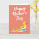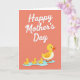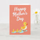 Designed with a cozy family scene, this digital illustration shows a larger yellow parent bird on the right leaning in with a tender, caring gaze toward three smaller chicks lined up to the left. The chicks sit one after another in light blue puddle-like shapes, and their close spacing suggests a gentle togetherness, like they’re following along on a shared path ❤️. The background is a coral-pink field that makes the sunny yellow feathers stand out, while orange beaks and feet add small pops of contrast. A soft pink blush on the parent bird’s cheek adds a sweet, affectionate touch without needing extra details. Across the top, the words “Happy Mother’s Day” appear in white lettering with a faint shadow, centered and easy to read. The overall look uses smooth, flat color areas and simple outlines, keeping the focus on the warm interaction 🌼. The connected blue water shapes run beneath the birds, forming a loose horizontal band under the line of chicks.