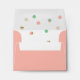 Personalize with your return address this coral pink wedding invitation envelope featuring a patterned interior with a scatter of pretty pastel dots in aqua, mint green, coral pink and tan with accents of faux copper foil. Change the background color and the text color by clicking the "Customize it" button.
