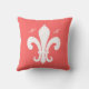 Fleur de lis monogram throw pillow | Coral pink color. Elegant fleur de lys design for classy home or business decoration. Perfect for sofa, couch or bed decor. Custom background color. Cute wedding gift idea for newly weds or husband and wife couple.