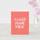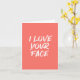 A pretty and cheerful birthday card with the sweet words I Love Your Face in white on a coral pink background. Inside text says Happy Birthday, but you can change it or add to it however you like!