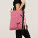 Chic designer looking carry all tote bag, done in coral with a tiny white polka dot pattern, with one side of the bag done in a coral and white striped pattern. Graphics of a black three ribbon band, runs down between the two backgrounds, on both sides of the bag. A two letter monogram, on the bottom right front, of the bag, is ready to personalize. What a great gift idea for her.
