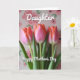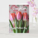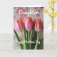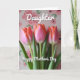 This card shows three slender flower buds standing close together like friends leaning in, their closed petals shading from blush pink near the base to warm coral-orange at the tips. The long green stems rise straight up, giving the arrangement a gentle, reaching feel that suggests quiet affection ❤️. Behind them, a softly blurred field of stylized pale-pink roses and muted green leaves creates a cozy backdrop without pulling focus from the bouquet. The lighting is soft and diffused, like early morning, adding a calm glow to the petals and stems. Near the top, the word “Daughter” appears in white lettering, centered and floating above the flowers. Below the bouquet, “Happy Mother’s Day” is also set in white, placed neatly so it feels like it’s cradled by the stems and blooms 🌼. The background remains a light pink wash with repeating rose shapes and faint greenery, while the three buds stay sharp in the foreground.