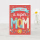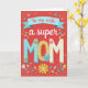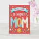 Designed with a warm coral-red background, this card centers on a loving message that feels like a quiet thank-you between partners ❤️. Near the top, an azure banner drapes across the page with the words “To my wife” in small rosy lettering. Just below, “a super” appears in flowing white cursive, leading into the large, raised-looking word “MOM” that takes the spotlight. The first “M” is sky blue with white polka dots, the “O” is golden yellow with a fine dotted texture, and the last “M” is creamy off-white with soft blue polka dots. Small floral cutout-style shapes cling to the letters, as if tucked there with care, adding a gentle, affectionate touch. Around the message, tiny blossoms in pink, blue, yellow, and white mingle with leafy branches, creating the feel of a bouquet offered with a tender glance 🌼. Along the lower edge, the flowers and greenery gather into a decorative border against the red field.