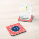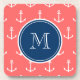 Coral White Anchors Pattern, Navy Blue Monogram Beverage Coaster