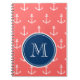 Coral White Anchors Pattern, Navy Blue Monogram Notebook