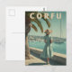 This elegant vintage poster showcases a woman in a flowing 1950s dress enjoying the scenic charm of Corfu. Set against a backdrop of pastel-colored buildings, sunlit hills, and the sparkling Ionian Sea, the scene captures the relaxed glamour of mid-century Mediterranean travel. Warm retro tones and nostalgic textures evoke the timeless beauty of this Greek island — perfect for lovers of vintage fashion, travel, and coastal elegance.