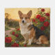 A tri-colored Corgi sitting amidst red roses during golden hour. The scene is depicted with the rich texture and soft lighting of a classical oil painting.
