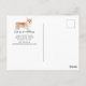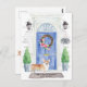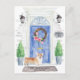 Announce your new address with our stylish announcement featuring a Corgi, blue front door, welcome mat, slate sign, topiaries and a floral wreath set on a gray brick background.