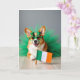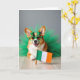 This card shows a Pembroke Welsh Corgi posed in the center, lying propped up with a direct, friendly gaze that feels like it’s meant just for you 💚. Soft natural light highlights its tri-color fur, from foxy-red ears to a bright white chest and paws, giving the scene a cozy, close-to-the-heart look. The St. Patrick’s Day outfit adds charm, with oversized green glasses and tiny leprechaun hats perched on each lens, finished with small gold buckle details ☘️. Behind the dog, an emerald-green tulle tutu spreads out like a soft halo, framing its face as if it’s dressed up for someone special. In the lower foreground, a small Irish flag stands upright, its green, white, and orange stripes slightly out of focus but clearly recognizable. St. Patrick’s Day greeting text sits near the top in green lettering, balanced and easy to read against the neutral background. The corgi’s open-mouthed smile and peek of pink tongue give the portrait a warm, companionable energy, like a cheerful friend leaning in for a photo. The setting stays simple with a pale wooden floor and a smooth gray backdrop that keeps attention on the green accessories and the flag.