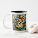 A Corgi wearing a Santa hat is portrayed in stained glass.