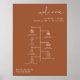 This wedding icon timeline and welcome sign features an edgy handwritten font and modern minimalist design and a bohemian terracotta burnt orange coloring. Click 'click to customize further' in the personalization section to open up the full editor. To add new icons, visit https://www.svgrepo.com/ and search the icon you need. Download as an svg and then drag and drop it into the Zazzle editor. Change the color of the icon on the right-hand side of the editor.